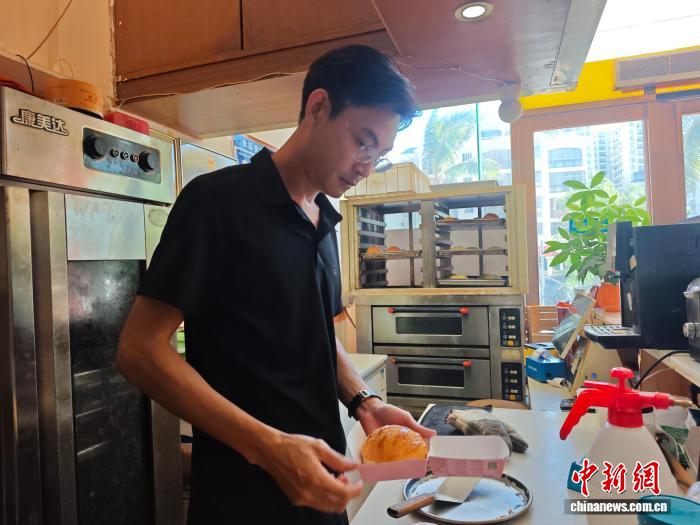 9月11日,海南三亚,阮锦贤正在打包港式菠萝包。 张月和 摄
