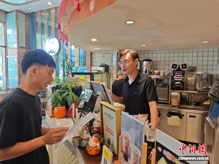 9月11日,海南三亚,阮锦贤(右一)接待前来港式茶餐厅消费的客人。 张月和 摄