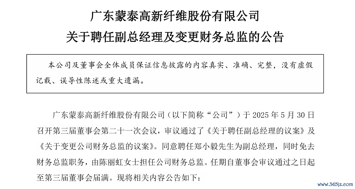 30日晚间,蒙泰高新同时宣布,公司董事会同意聘任郑小毅为副总经理,同时免去其财务总监职务。此外,董事会同意聘任陈丽虹担任公司财务总监职务,任期自董事会审议通过之日起至第三届董事会届满之日止。