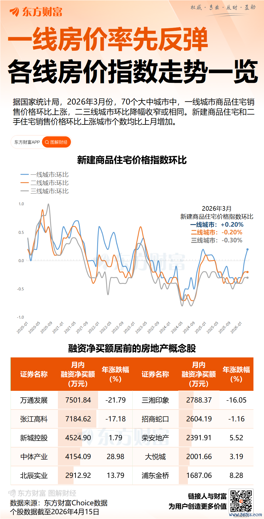 数据显示,3月份,一线城市新房价格环比由上月持平转为上涨0.2%。其中,北京持平,上海、广州和深圳分别上涨0.3%、0.3%和0.2%。二、三线城市新房价格环比分别下降0.2%和0.3%,降幅均与上月相同。
